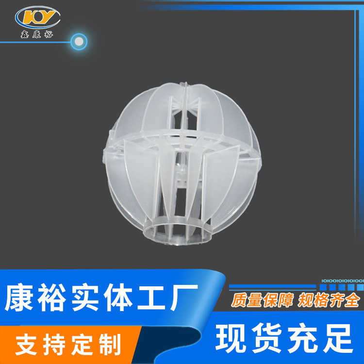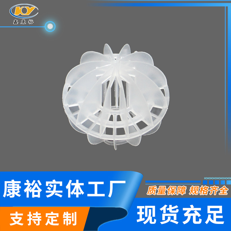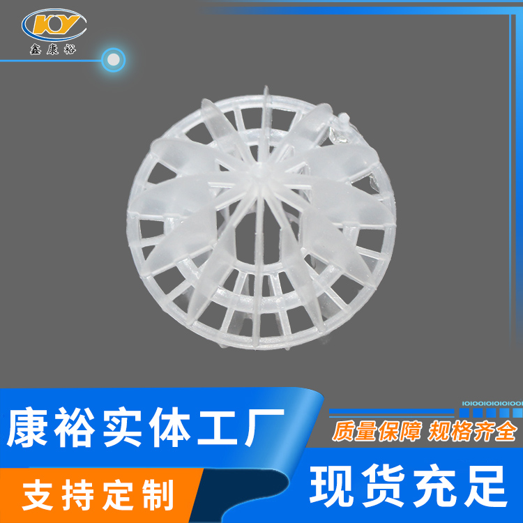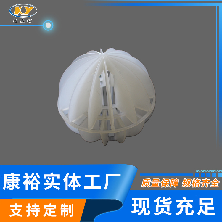 塑料多面空心球填料是水處理項目和廢氣處理常用到的一種填料,也是現在環保裝置項目常見的一種填料,大多采用聚丙烯(PP)塑料制成。多面空心球填料,在球中部沿整個周長有一道加固環,環的上下各有十二片球瓣,上下球瓣互相交錯,沿中心軸呈放射形布置。多面空心球填料具有表面積大,傳質效率高,產品的球瓣與球瓣之間空間大,且重量輕、強度大、安裝方便、葉片多,阻力小,耐高溫,耐腐蝕,性能穩定,適用于中間水箱,二氧化碳脫氧塔,接觸反應塔等裝置。在全國電力、化學、化纖、電子、造紙、化肥生產、河水淡化,環保、三廢處理等行業的水處理、脫碳、脫氣、凈化、脫碳酸及油水分離等處理裝置中廣泛使用。